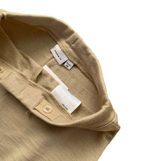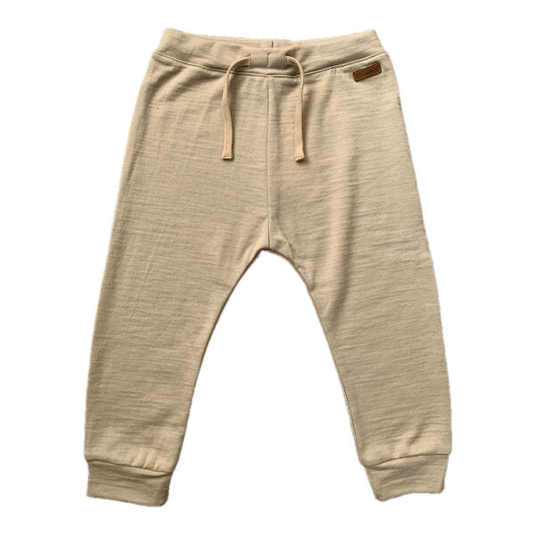 Brīvā laika bikses no merino vilnas. Krāsa - bēša. Viduklis regulējams ar gumiju un pogām. Merino vilnai piemīt lieliskas īpašības - maigums, elpojamība, termoregulācija. Tā uztur siltumu aukstā laikā, savukārt siltā laikā neļauj sakarst. Tā absorbē mitrumu no ādas un izvada to, kā arī, dabiski pretojas baktērijām.