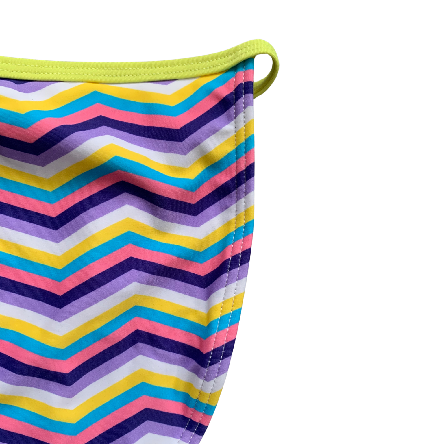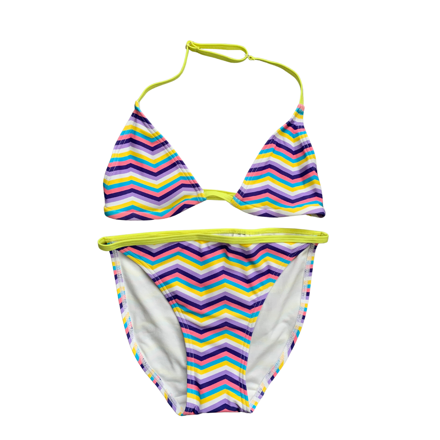 Krāsains, divdaļīgs peldkostīms. Augšdaļas lenču garums regulējams - gan apkārtmēram, gan ap kaklu.