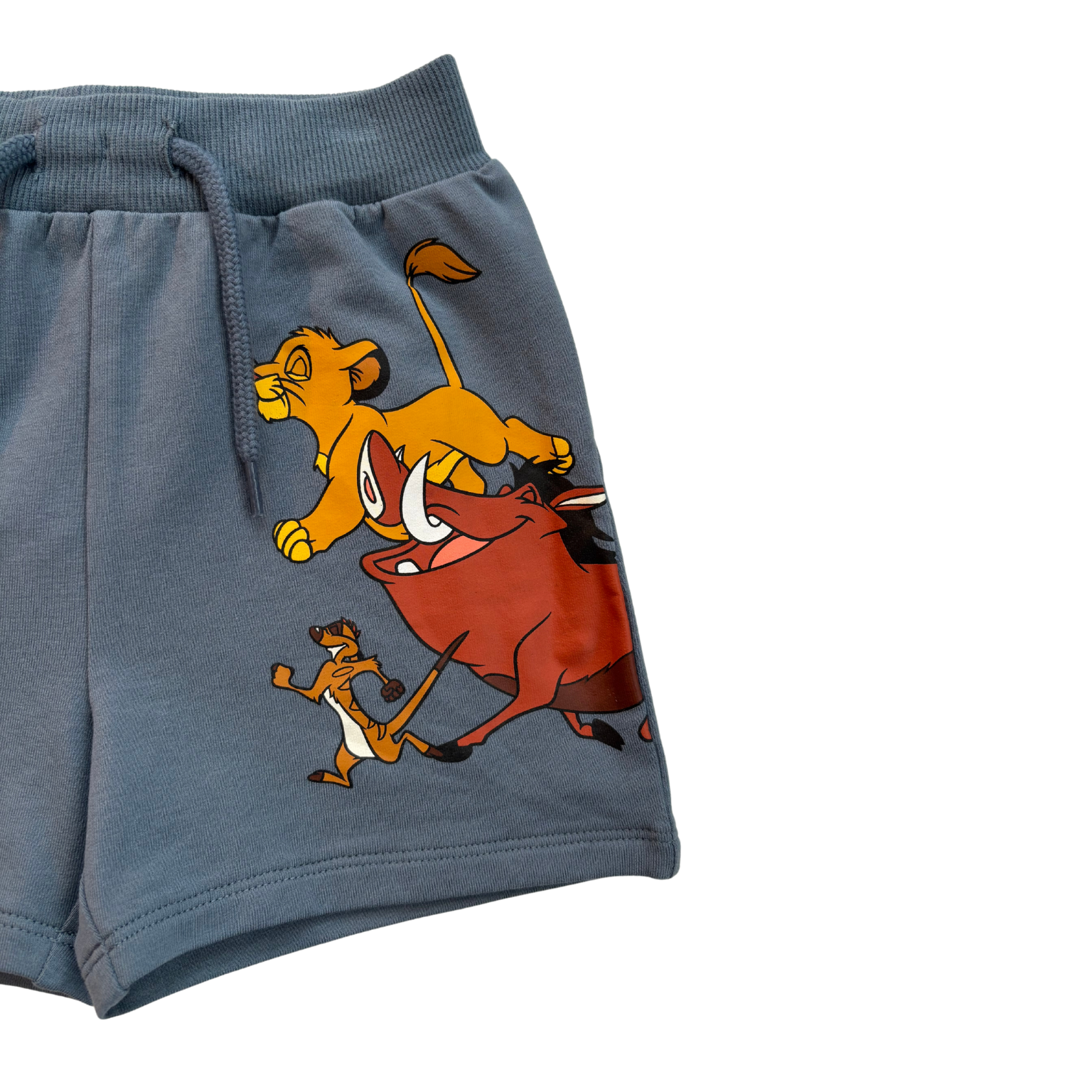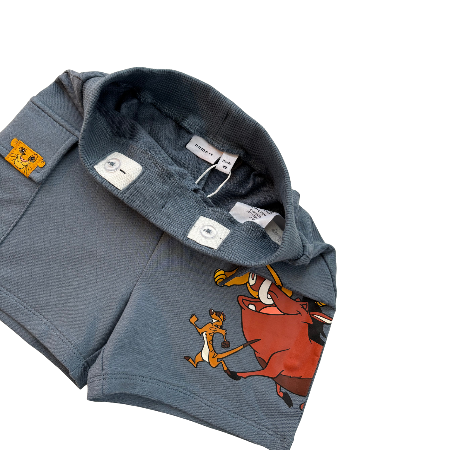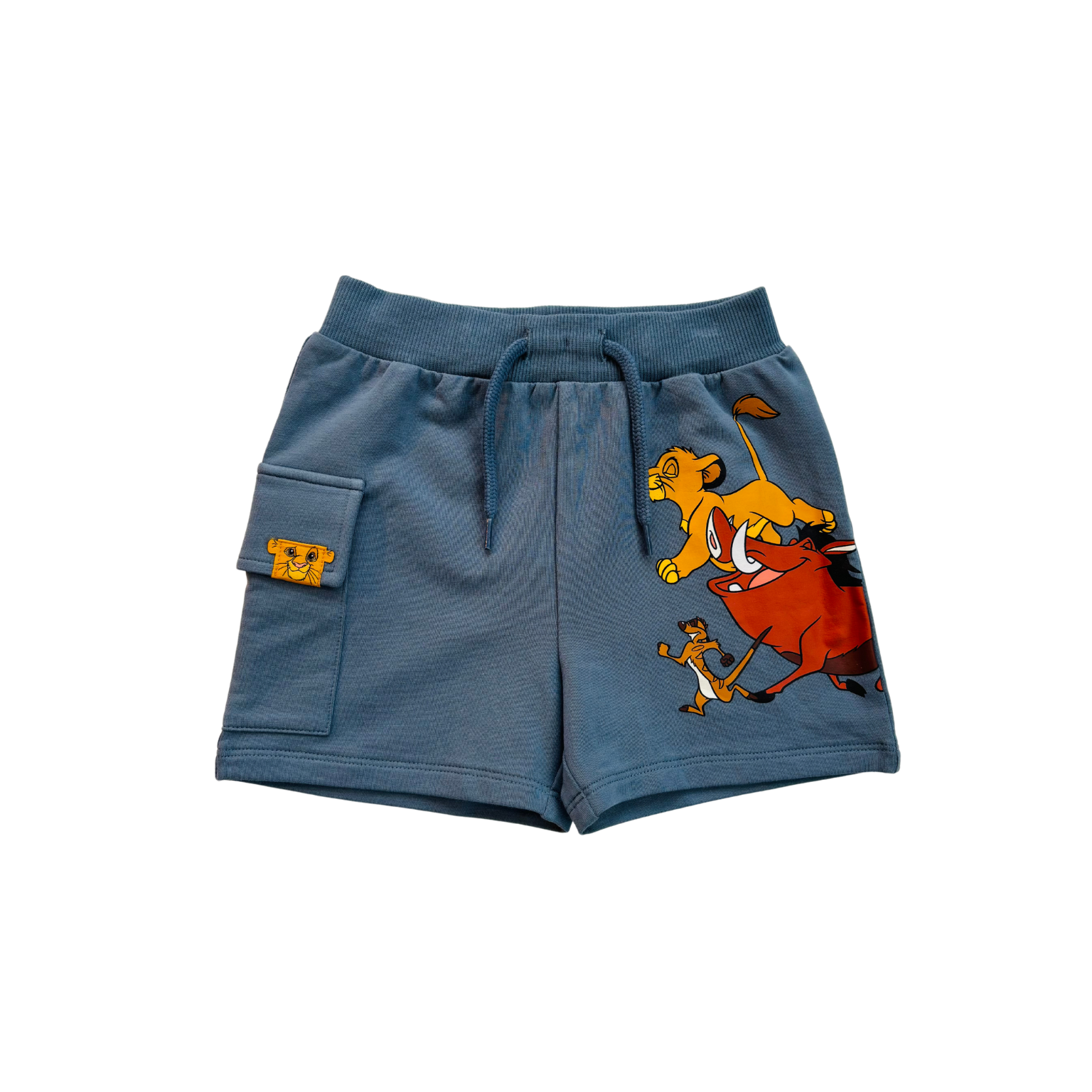 Zili šorti ar kabatu uz vietas staras, Lion King prints. Viduklis regulējas ar pogām un gumiju jostā.