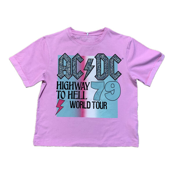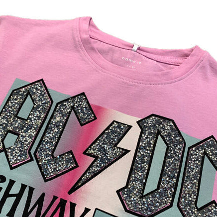 Rozā oversize krekls AC/DC ar printu. Burti dekorēti ar līmētiem akmentiņiem.