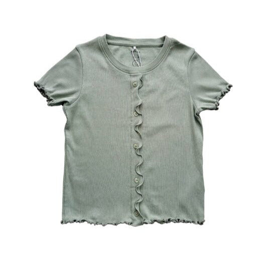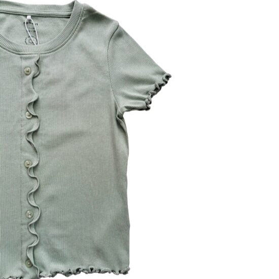 Mint krāsas t-krekls, ribbed audums. Dekoratīvas pogas. Audums ļoti maigs uz tausti, jo sastāvā modāls. Crop garums.