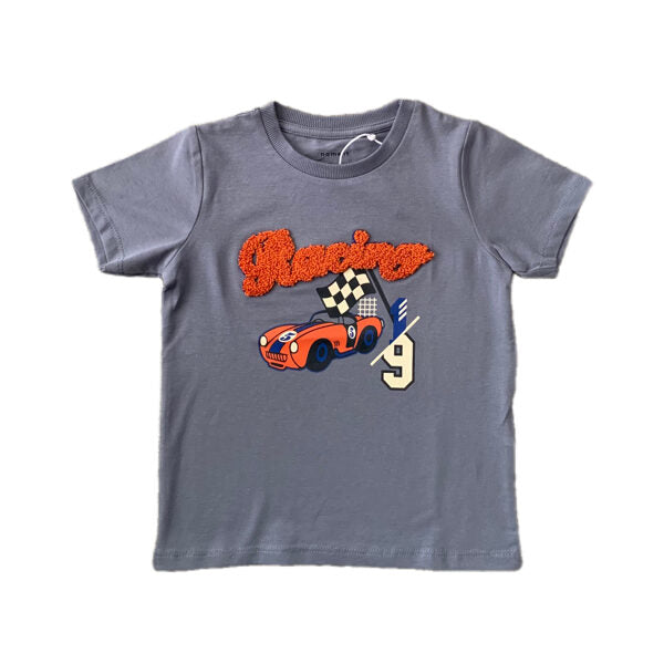 Zils tkrekls ar izšūtu uzrakstu un auto printu.