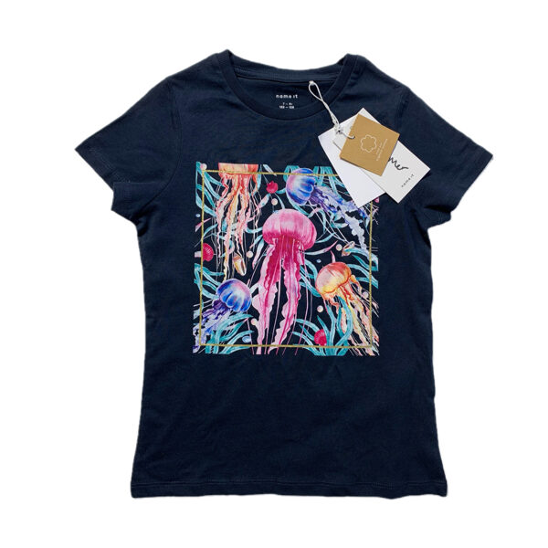 Tumši zils t-krekls ar krāsainu printu, printam apkāt rāmītis ar zeltītu spīdumiņu.