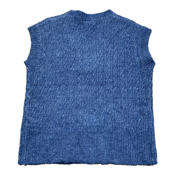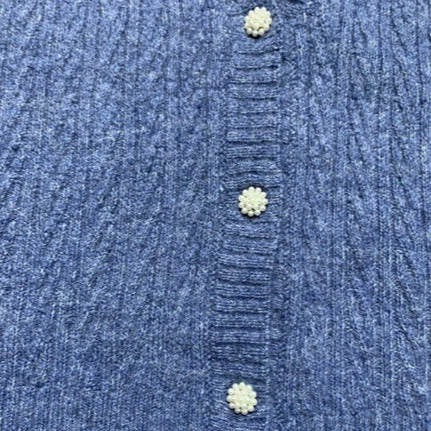 Zila adīta veste ar pīņu rakstu. Mazu pērlīšu pogas. Veste taisna piegriezuma. Uz tausti maigs adījums.