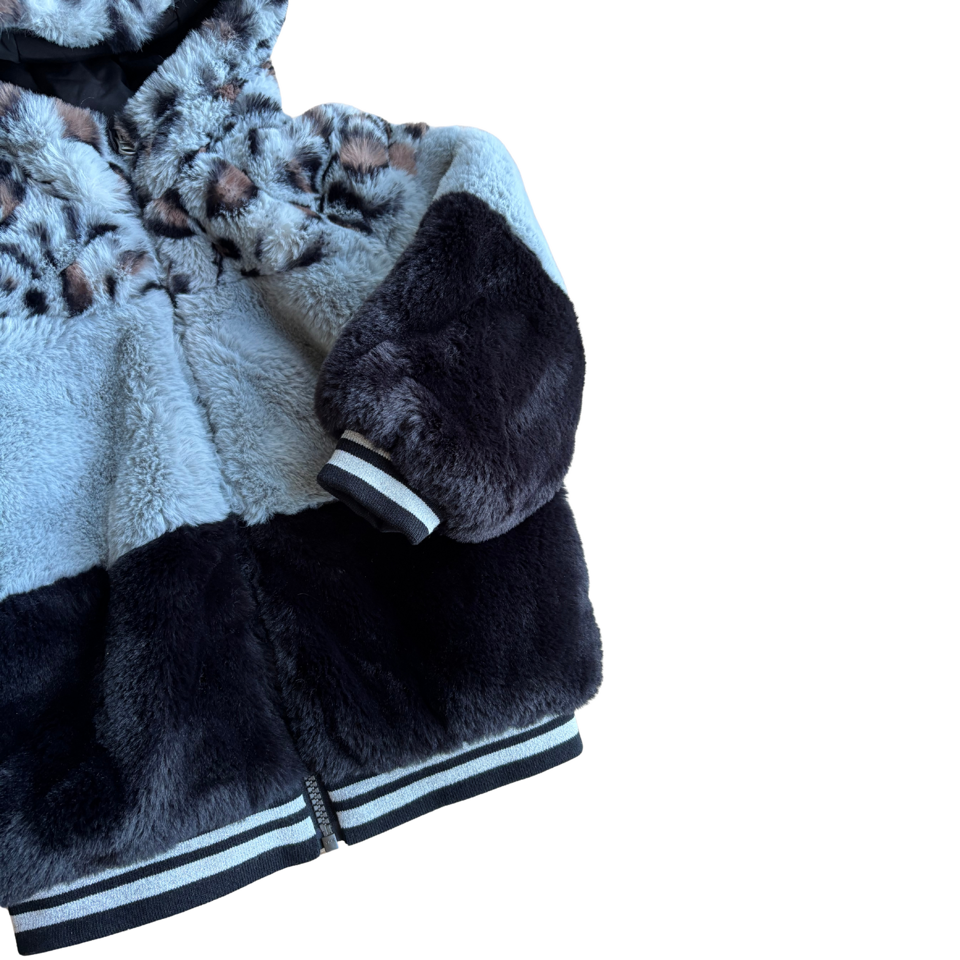 Divpusēja virsjaka - viena puse mākslīgais kažociņš, otra virsdrēbju audums. Ir sānu kabatas. Būs piemērots aukstai starpsezonai, siltai ziemai.