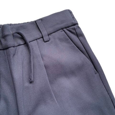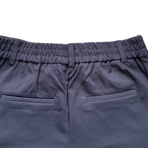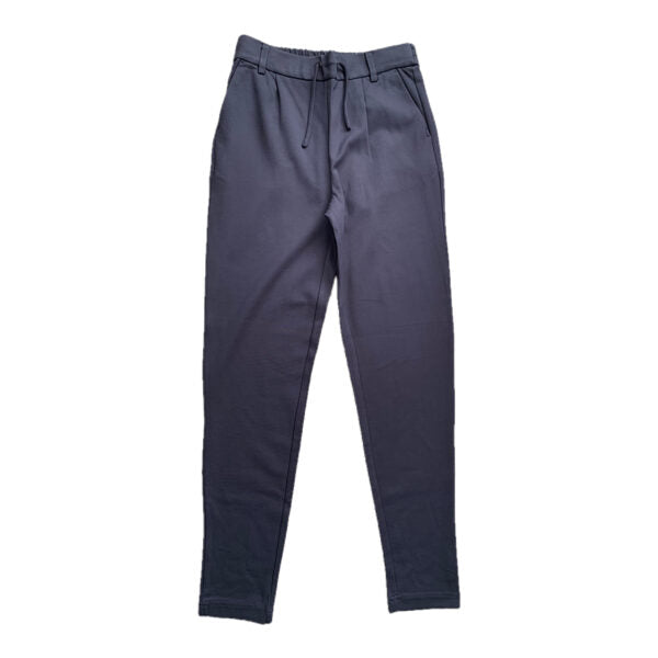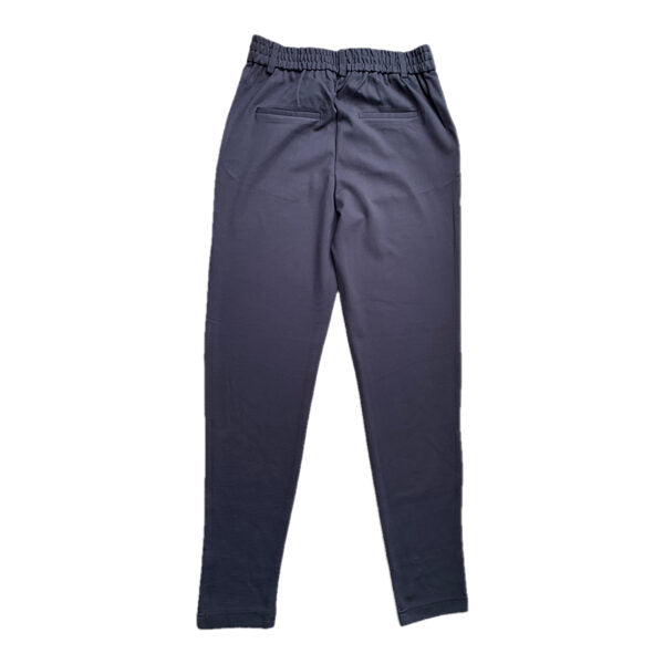 Tumši zilas vidēji bieza auduma bikses ar sānu kabatām. Maigs audums uz tausti. Vidukļa apkārtmērs regulējams.