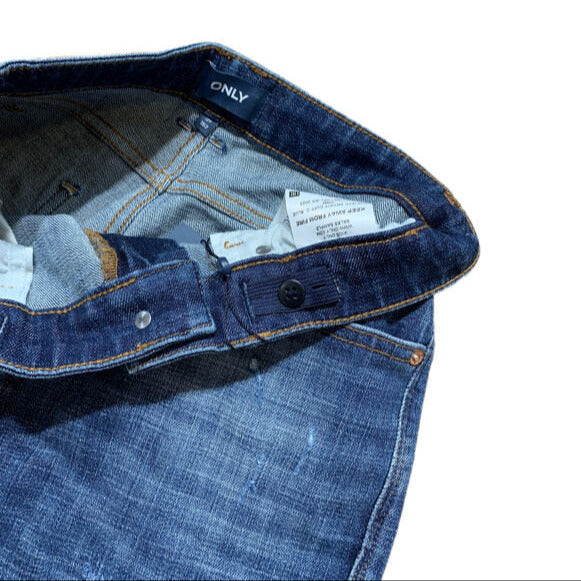Tumši zili Only džinsi. Vidukļa apkārtmērs regulējams.
