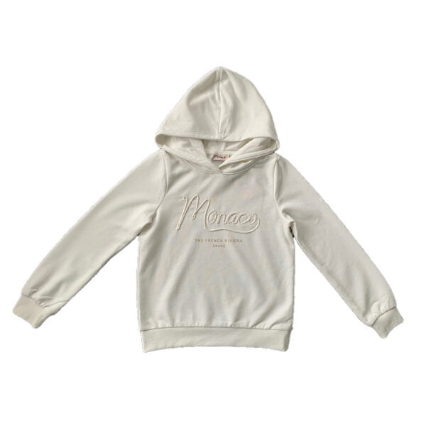 Krēmkrāsas meiteņu hūdijs ar izšūtu uzrakstu priekšpusē. Nav siltināts.
