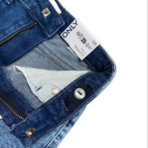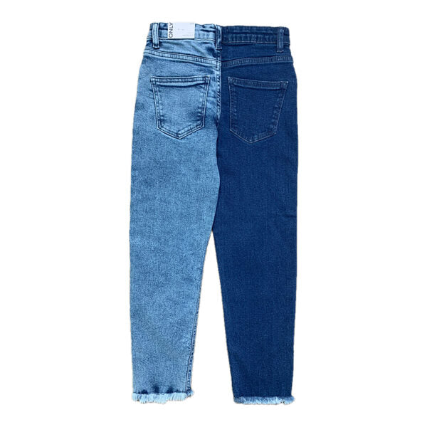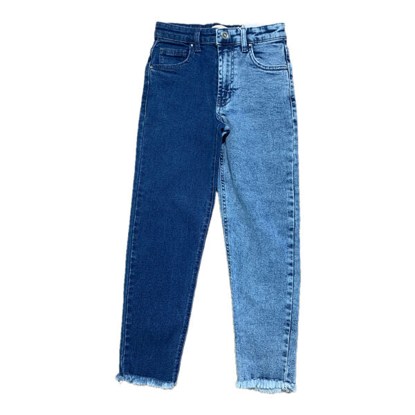 Mom fit džinsi ar divu krāsu krāsojumu. Vidukļa apkārtmērs regulējams. Poga ar āķa aizdari.