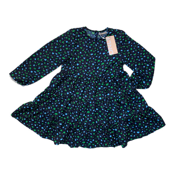 Tumši zila kleita ar košu zili-zaļu printu. Kleita pakāpeniski kupla, volānveidīga svārku daļa.