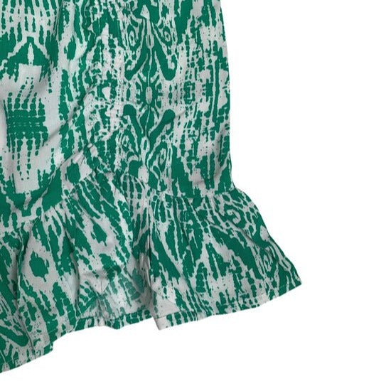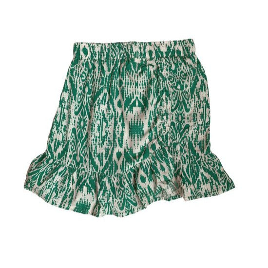 Gaiši svārki ar zaļu rakstu. Viduklis regulējams, apakšmala ar volānu. Viegls, patīkams audums.