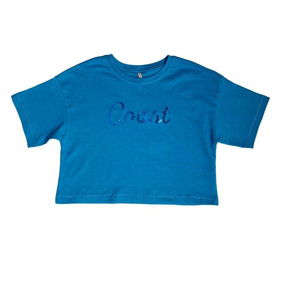 Zils T-krekls ar izšūtu gliteru uzrakstu. Krekls ir crop garuma un mazliet oversize.