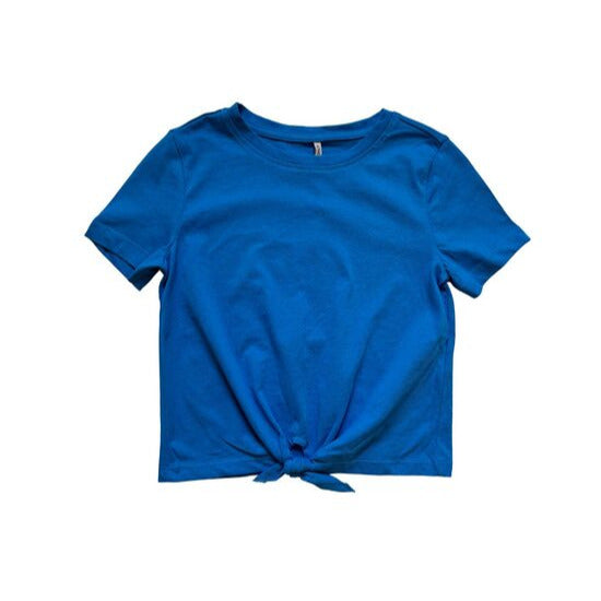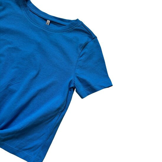 Zils t-krekls ar priekšpusē sasienamu mezglu. Crop garums.