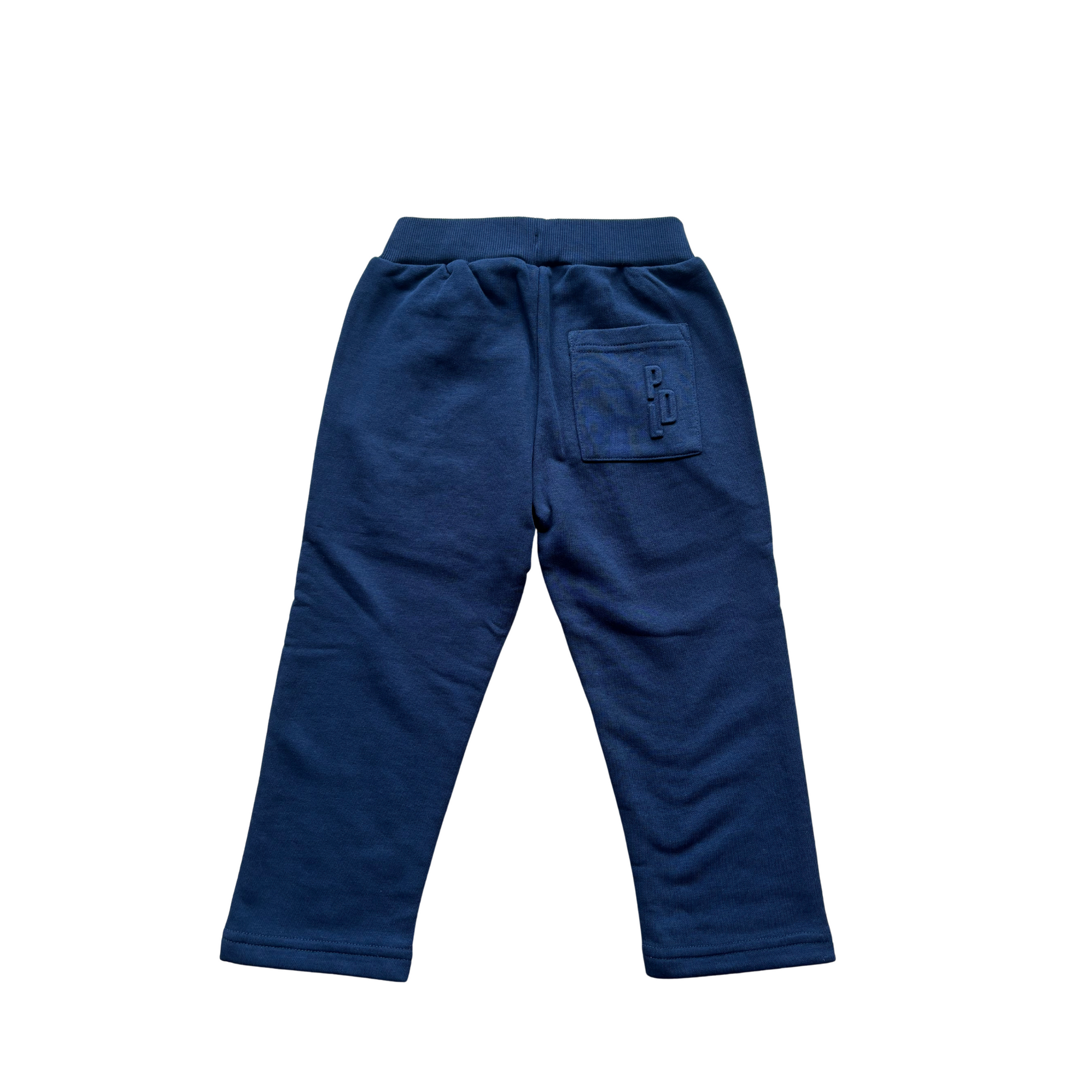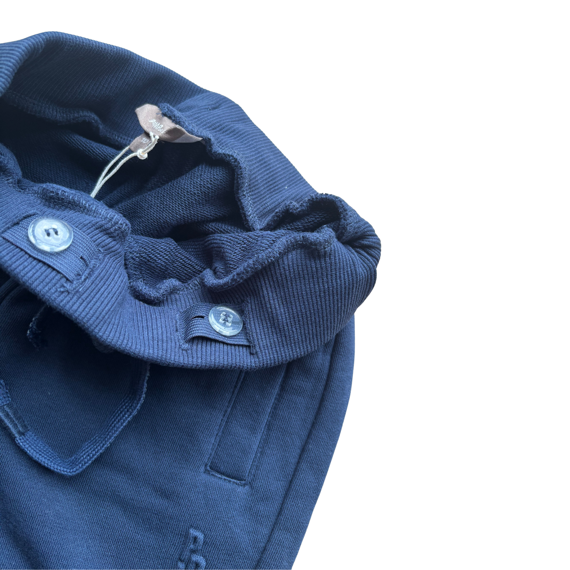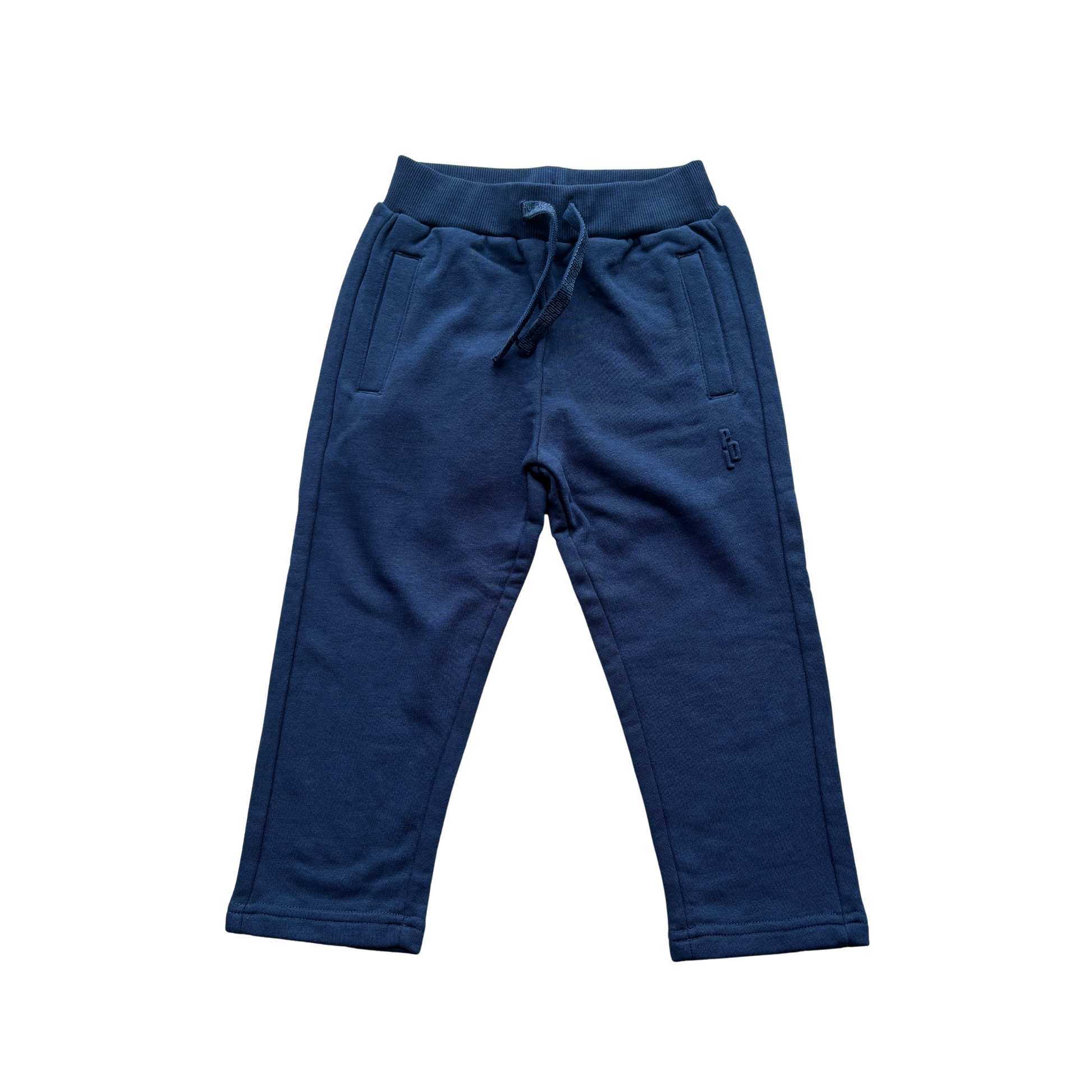 Tumši zilas brīvā laika bikses, viduklis regulējams, sānos kabatas.