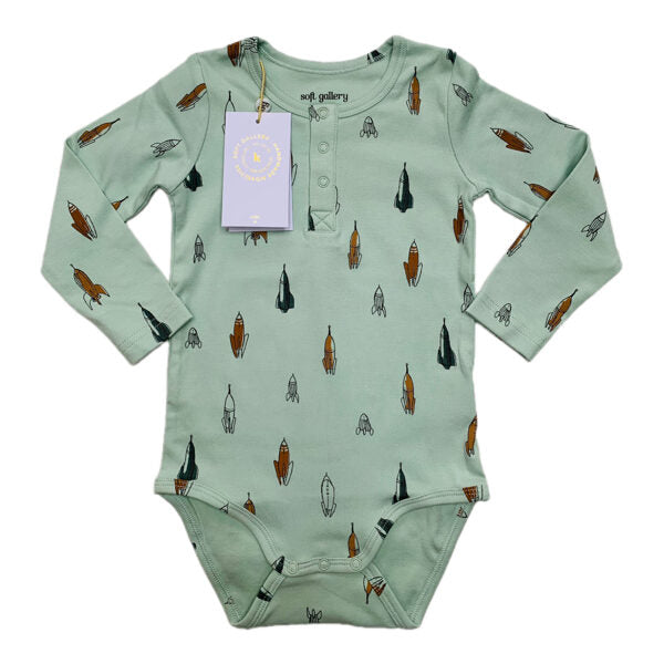 Mazuļu bodijs ar raķešu printu. Priekšpusē spiedpogas ērtākai ģērbšanai.