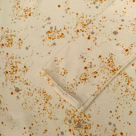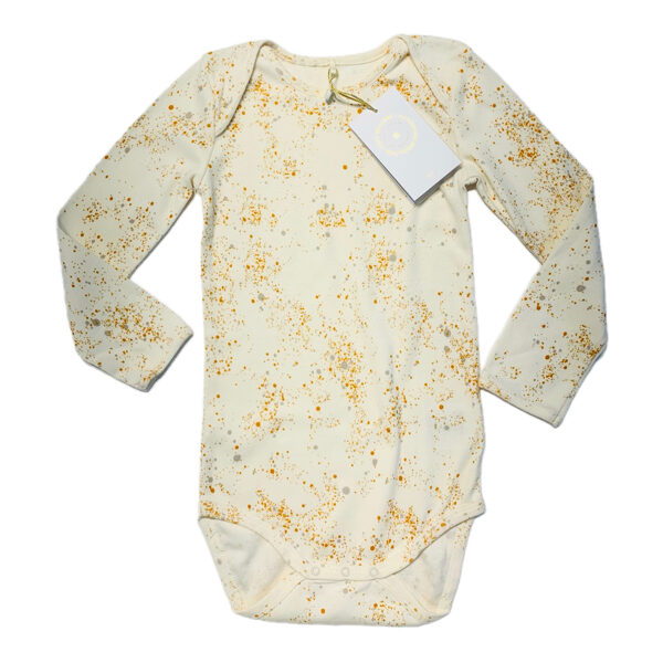 Krēmkrāsas garroku bodijs ar oranžiem, pelēkiem punktiņiem. Plecu daļā brīvāks šuvums ērtākai ģērbšanai.