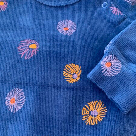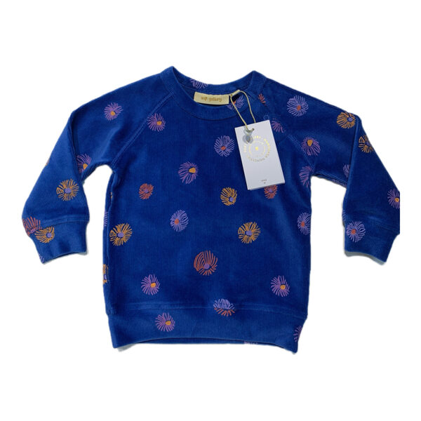Koši zils velveta džemperis ar ziedu printu. Pleca daļā spiedpogas ērtākai ģērbšanai.