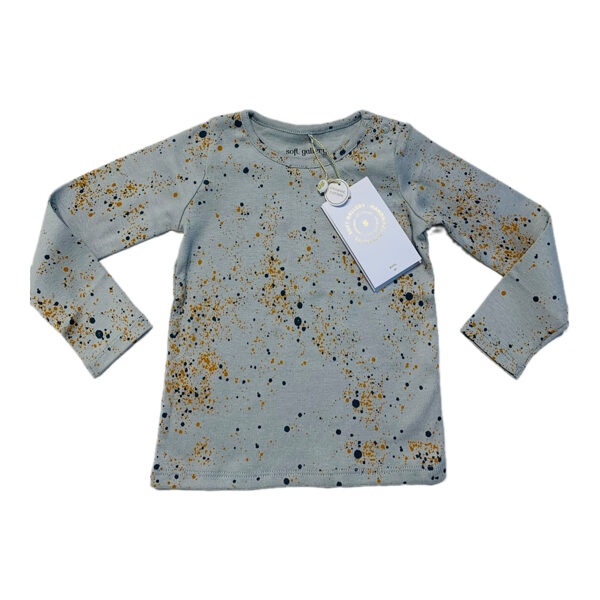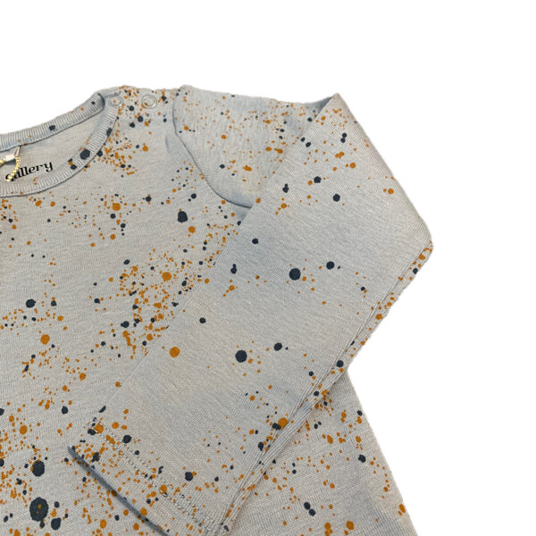 Pelēks ar punktainu printu garroku krekls no organiskās kokvilnas. Uz tausti ļoti maigs audums. Pleca daļā spiedpogas ērtākai ģērbšanai.