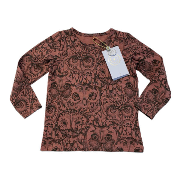 Sarkanbrūns garroku krekls ar pūču printu. Pleca daļā spiedpogas ērtākai ģērbšani.