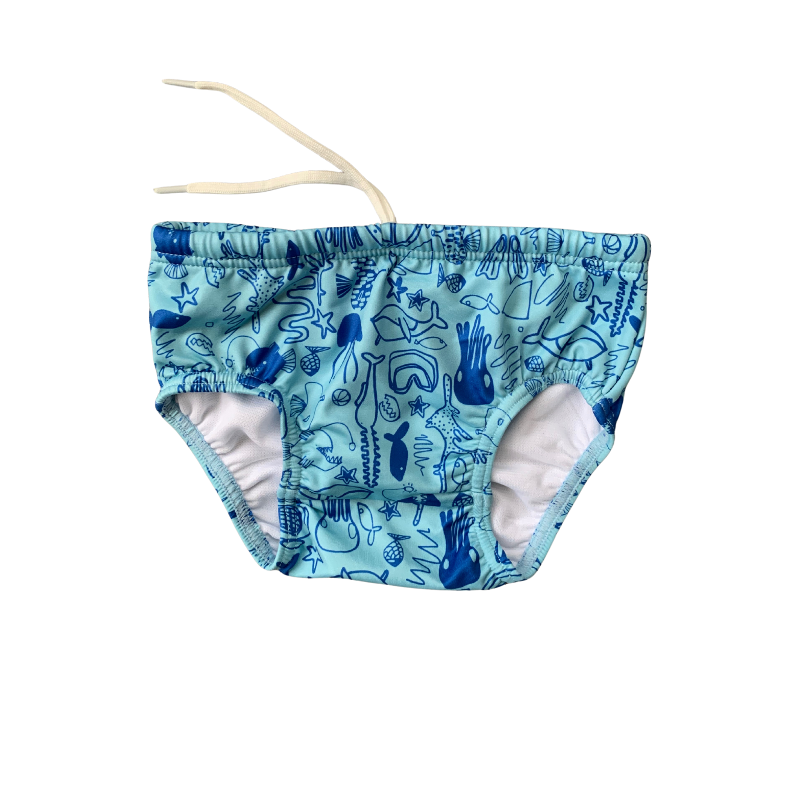 Zilas peldbikses ar jūras tematikas rakstu. UPF 50+ (ultraviolet protection factor) aizsardzība.