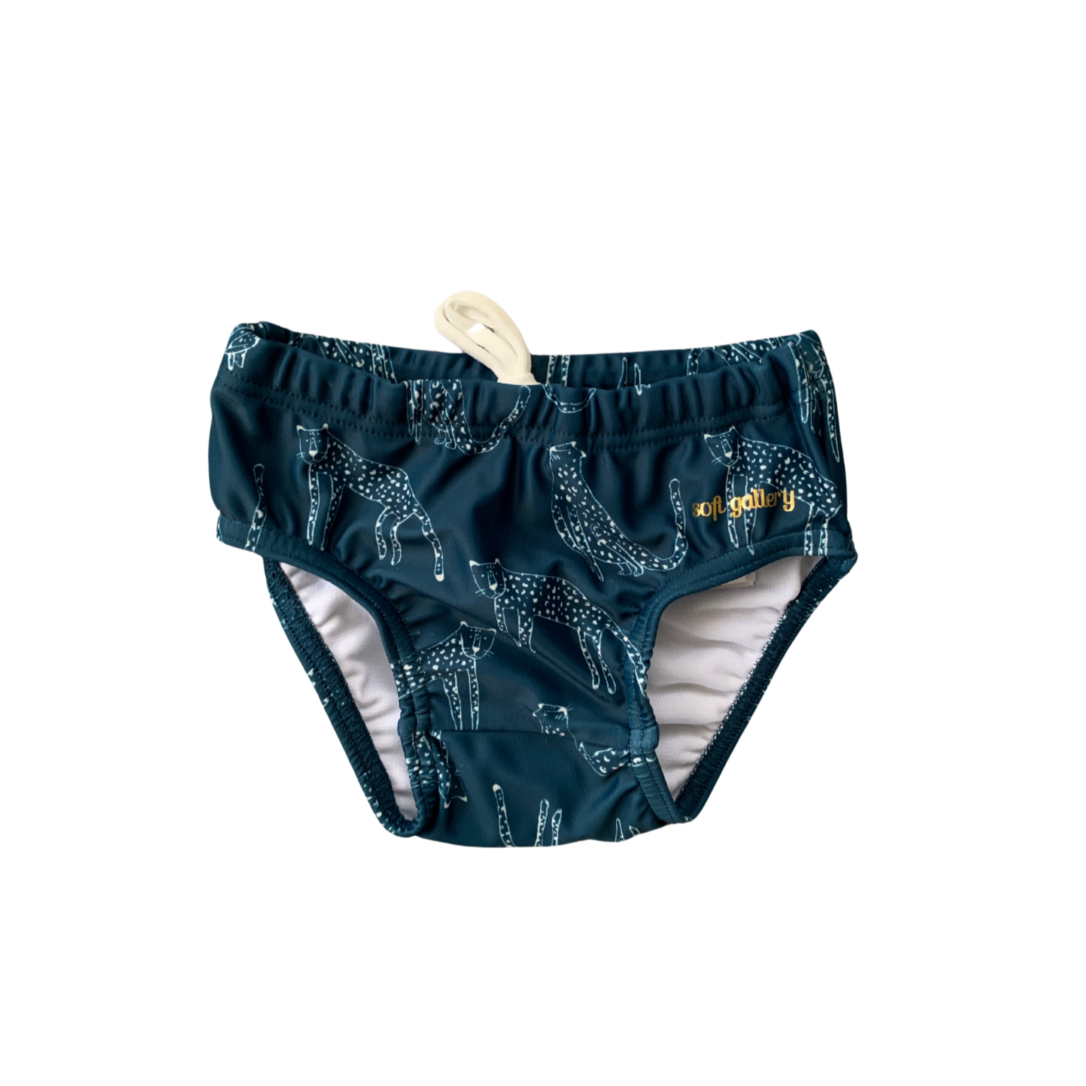 Tumši zilas peldbikses ar leopardu printu. UPF 50+ (ultraviolet protection factor) aizsardzība.