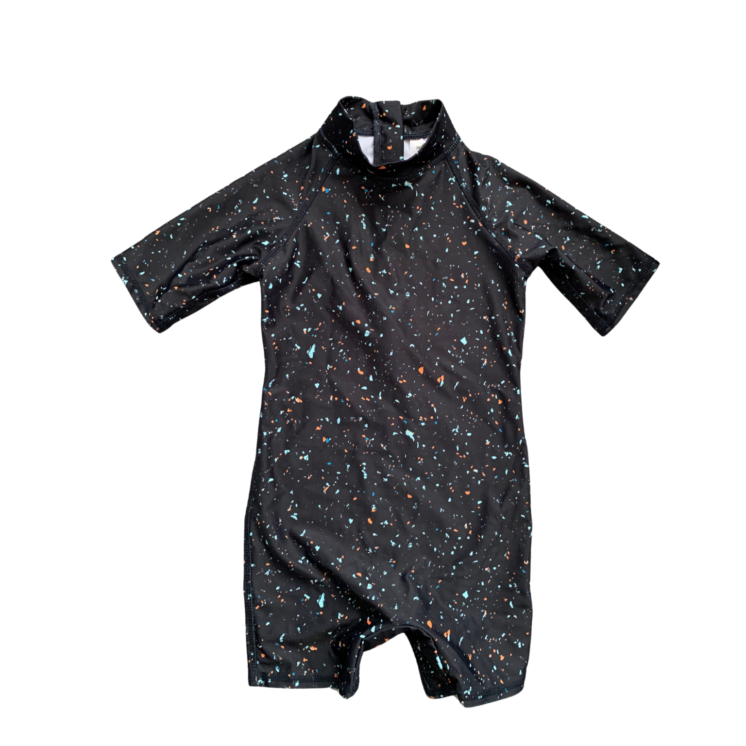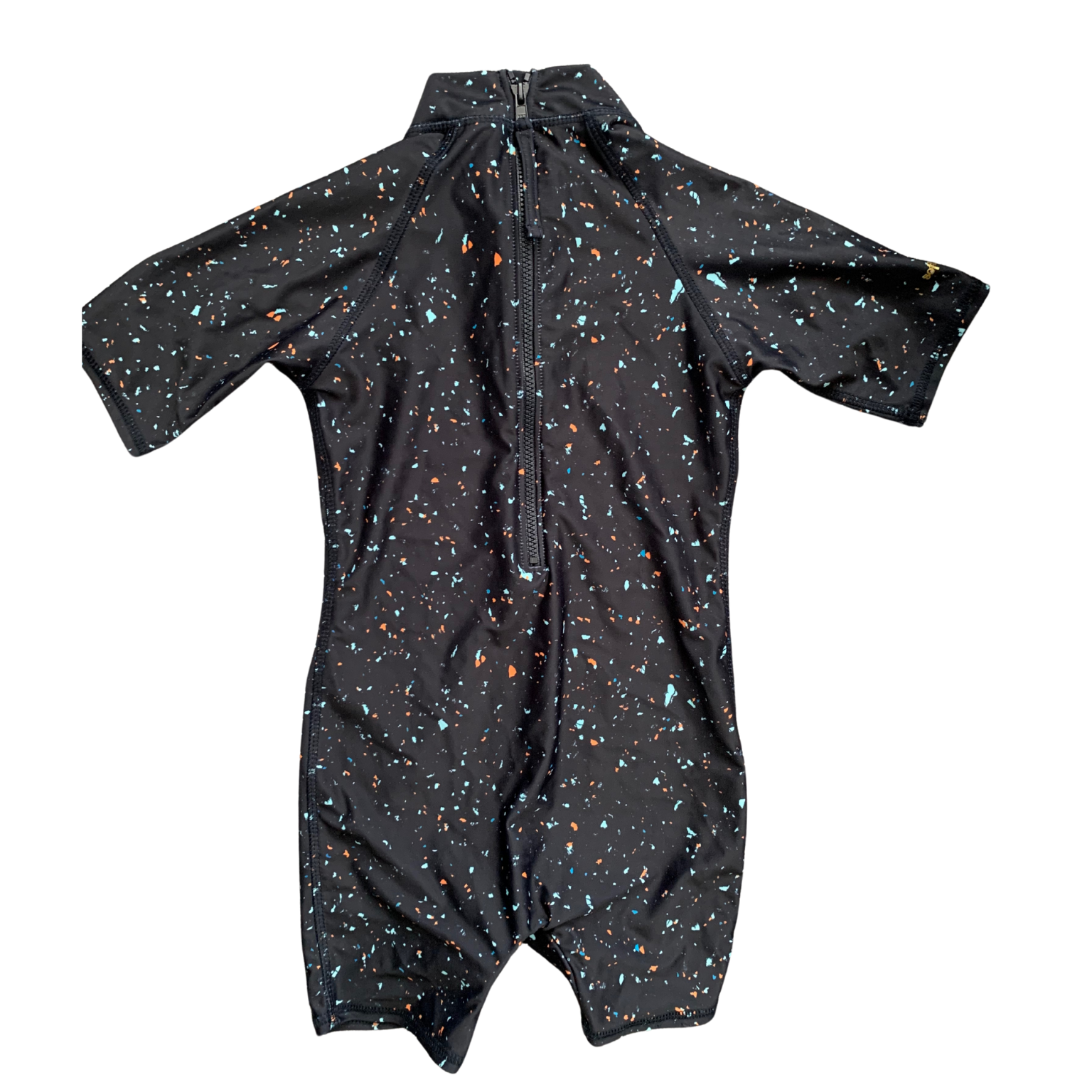 Tumšas krāsas peldtērps ar krāsainu printu. UPF 50+ (ultraviolet protection factor) aizsardzība.