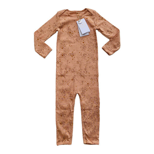 Pilna auguma bodijs rozā krāsā ar oranžiem, violetiem punktiem. Kāju iekšpuse pogājas ar spiedpogām visā to garumā ērtākai bērna aprūpei.