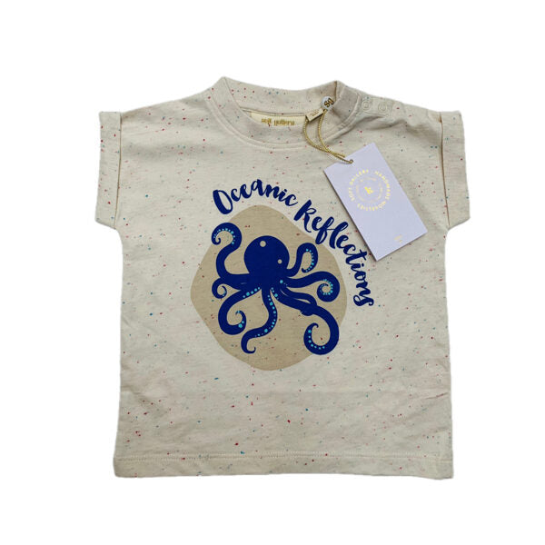Mazuļu tkrekls krēmkrāsā ar krāsainiem punktiņiem audumā, pleca daļā spiedpogas ērtākai ģērbšanai.