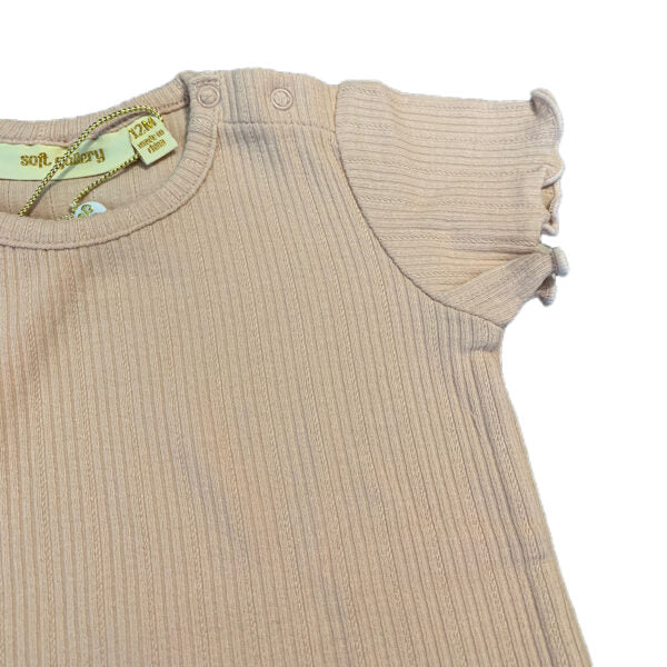 Maigi rozā t-krekls no ribbed kokvilnas auduma. Roku malas un krekla apakšmala kruzuļaina. Pleca daļā spiedpogas ērtākai ģērbšanai.