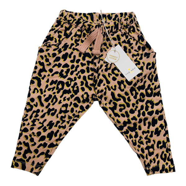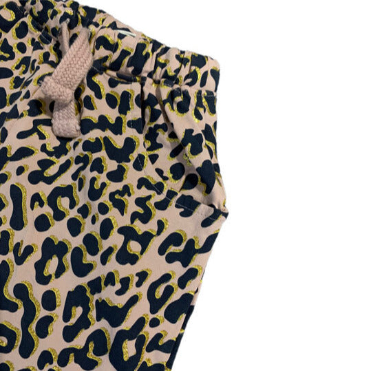 Brīva piegriezuma bikses ar leoparda raksta printu, zelta spīdums. Viduklis regulējas ar lentēm.