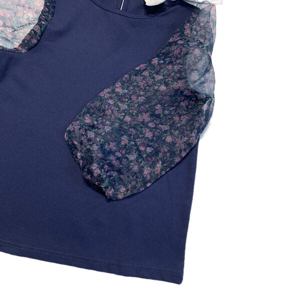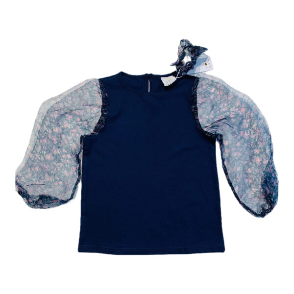 Tumši zila, vidēji bieza auduma blūze , puķainas organza auduma piedurknes. Komplektā pieskaņota matu gumija.