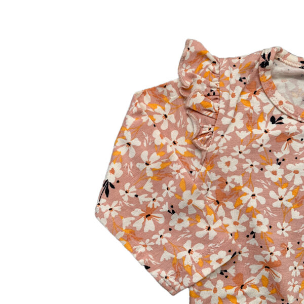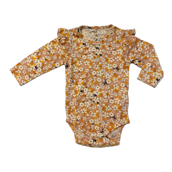 Mazuļu bodijs no Liva-eco viskozes. Maigs audums, baltu ziedu prints. plecu daļā volāniņš. Pleca daļā divas spiedpogas ērtākai ģērbšanai.