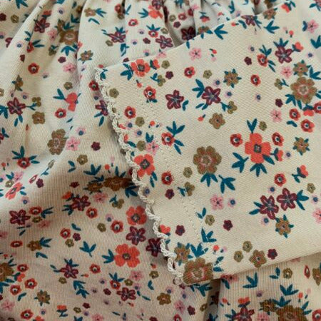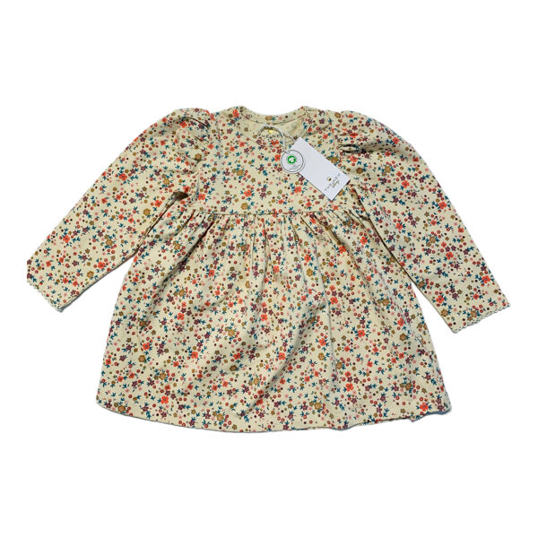 GOTS sertificēta kokvilnas auduma kleita ar garām rokām. Apkaklīte un piedurkņu gali ar smalku diegu mežģīni, pleca daļā spiedpogas ērtākai ģērbšanai. Smalku ziediņu prints, zeltīti ziedi ar mazu mirdzumiņu.