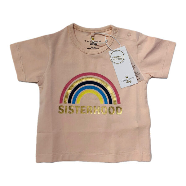 Mazuļu tkrekls maigi rozā krāsā ar spīdīgu varavīksnes printu un uzrakstu. Pleca daļā spiedpogas ērtākai ģērbšanai.