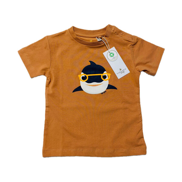 Mazuļu tkrekls no GOTS sertificētas kokvilnas. Ar haizivs motīvu. Pleca daļā spiedpogas ērtākai ģērbšanai.